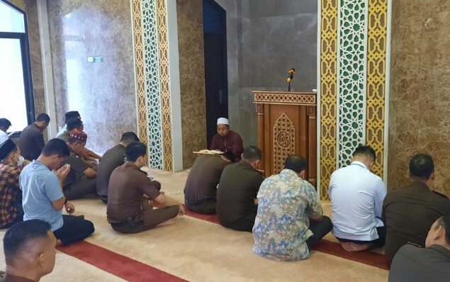 Kegiatan Tausiyah Ba’da Dzuhur di Masjid Al-Mizan Kejaksaan Tinggi Riau mengikuti secara ketat protokol kesehatan (prokes). (ded)