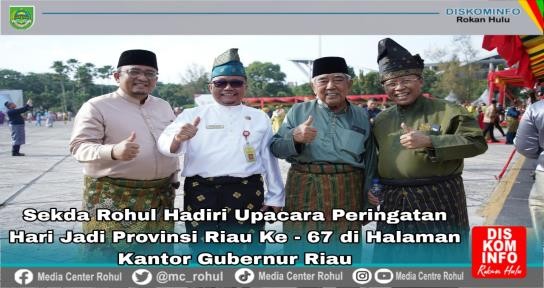 Mewakili Bupati Rokan Hulu(Rohul) Sekretaris Daerah (Sekda) Rokan Hulu Muhammad Zaki, S.STP, M.Si didampingi Ketua DWP Ny Siska Irdaningsih Zaki Hadiri dan Ikuti Upacara Hari Ulang Tahun (HUT) Provinsi Riau ke 67, di Halaman Kantor Gubernur Jl.Sudirman Pekanbaru, Jumat (9/8/2024).