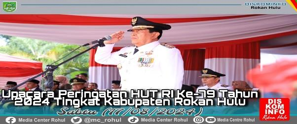 Memperingati Hari Ulang Tahun (HUT) Republik Indonesia (RI) ke 79, Pemerintah Kabupaten Rokan Hulu(Rohul) menggelar Upacara di Halaman Kantor Bupati, Sabtu (17/8/2024) dengan mengangkat Tema " Nusantara Baru Indonesia Maju".