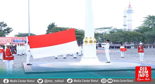 Sementara Petugas Pengibaran Bendera Sang Merah Putih, Danki Pasukan Letda Inf Sutrisno Jabatan Danton SMS Kompi Bantuan Yonif 132 Bima Sakti, Dan Pasukan 8 Petugas Pembawa Baki Pengibaran penjemput Bendera Delmiati Siswa SMAN 1 Ujung Batu, Putri dari Ayah Alm. Uwan dan Ibu Eti, Pengibar Bendera Penarik Tali Muhammad Daffa Budiman Siswa SMAN 1 Rambah Hilir, Putra dari Ayah Husni Budiman, Ibu Akyuni, Pembentang Bendera Faisal Ramadhani Siswa Ponpes Basma Putra dari ayah Suryadi Ibu Nurbaiti, Pemberi Aba aba Reno Cahyadi Siswa SMA N 1 Ujung Batu, Putra dari ayah Diki Setiadi ibu Ningsih Asih, Pengapit Kanan Pengamil Bendera Aldo Akma Anggota Polri dan Pengapit Kiri Pengambil Bendera Imanuddin Maulana Lubis Anggota Polri.