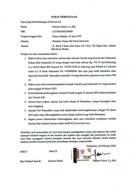 dan pihaknya dalam pernyataan tersebut berjanji akan memberangkatkan jamaah umroh pada tanggal 4 Maret 2025. dan segala makan minum dan hotel selama di Pekanbaru akan di tangung oleh pihaknya. dan apabila pernyataan tersebut tidak benar maka pihaknya siap di tuntut sesuai hukum yang berlaku di Indonesia. (red/tim)