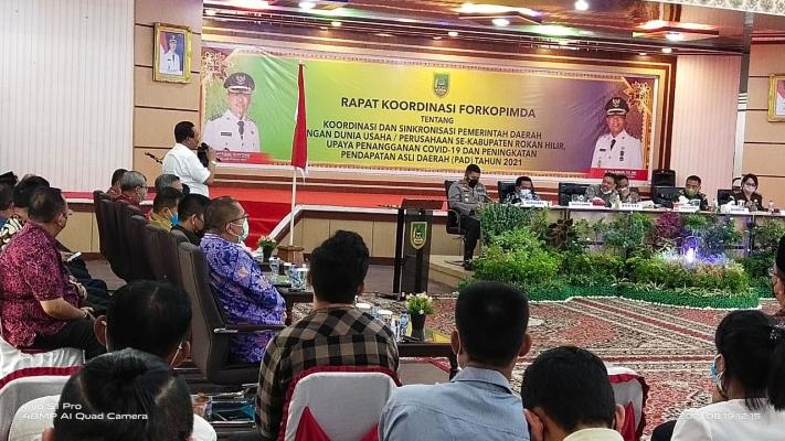 ROHIL - Bupati Rohil Afrizal Sintong memimpin rapat koordinasi bersama Forkopimda dengan dunia usaha yang ada di wilayah kabupaten Rohil.Rakor tersebut membahas sinkronisasi Pemkab Rohil dengan dunia usaha dalam upaya penanganan Covid-19 dan peningkatan pendapatan asli daerah (PAD),Rapat koordinasi dilaksanakan di gedung Misran Rais Bagansiapiapi,Rabu (19/8/2021).